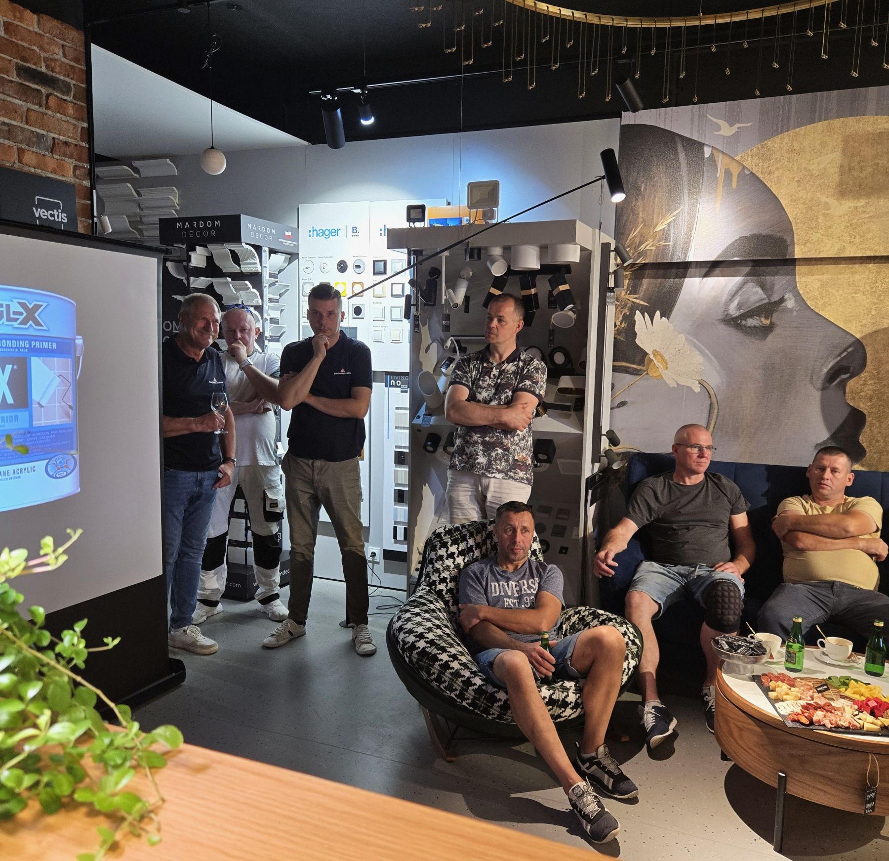 Szkolenie było doskonalą okazją do prezentacji nowości w naszej ofercie - dekoracyjnych efektów ściennych włoskiej marki SPIVER. Szczególnym zainteresowaniem cieszyła się farba, tynki naturalne oraz gliniano-wapienne z cząsteczkami złota, miki, magmy z wulkanu Etna, czy specjalnego kolorowego szkła z wyspy Murano. Nie zabrakło klasycznych stiuków, efektu rdzy i wielu innych dekoracji ściennych, zarówno matowych, jak i metalicznych.