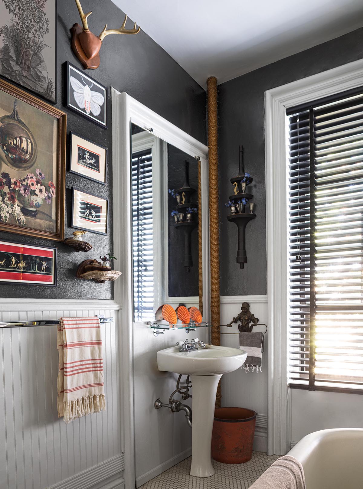 Styl vintage odnajdzie się również w łazience. Na zdjęciu widzimy ścianę „artystyczną”, która dzięki obrazom, grafikom i dekoracjom wysuwa osobowość właściciela domu na pierwszy plan. Stormy Sky 1616 na górnej części ścian zapewnia idealną równowagę – wprowadzając poczucie wyrafinowania