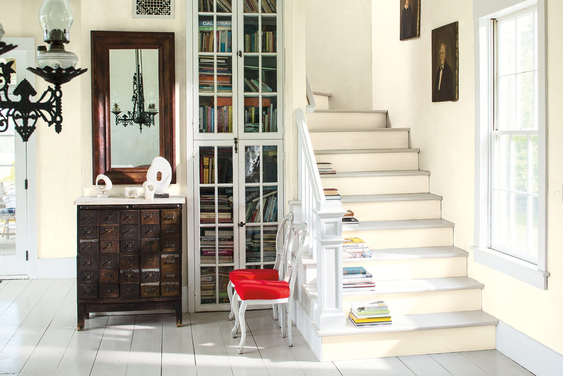Ta ciepła przestrzeń życiowa w kolorze White Opulence OC-69 pozwala na wyeksponowanie mebli oraz dodatków. Schody i wykończenia w kolorze Decorator's White OC-149 zapewniają elegancję natomiast książki ułożone wzdłuż schodów nadają przestrzeni przytulności.