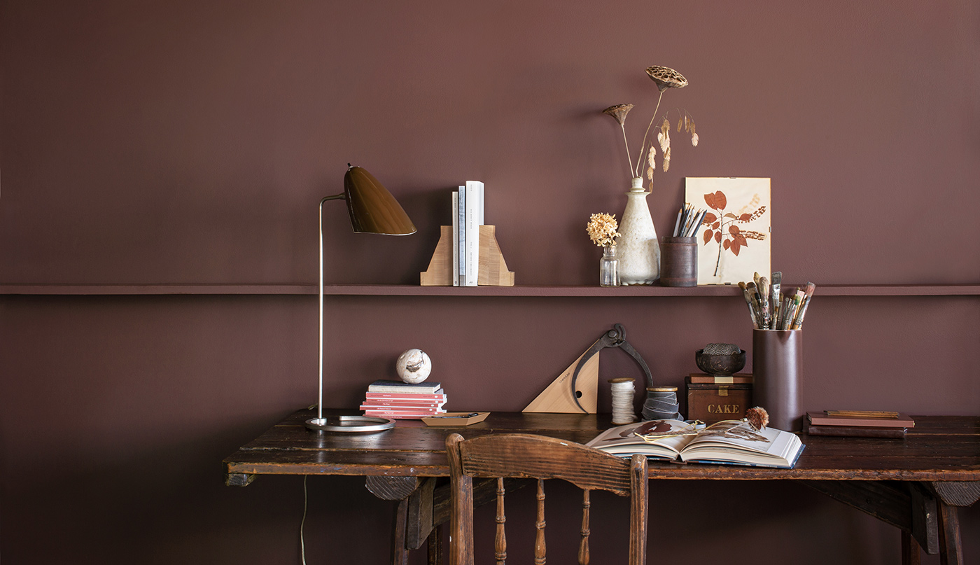 Pokazana czytelnia wyposażona jest w regał, który idealnie nadaje się do pokazania przedmiotów, które wyrażają Twoją osobowość. Wysokie regały lub półki ścienne od podłogi do sufitu mogą dodać architektonicznej głębi każdemu pomieszczeniu, a farba ADVANCE®, zapewni eleganckie, profesjonalne wykończenie. Książki i ramki zostały ustawione na półkach pomalowanych kolorem Edgecomb Gray HC-173, ponadczasową szarością, która w satynowym stopieniu połysku doda blasku pomieszczeniu.