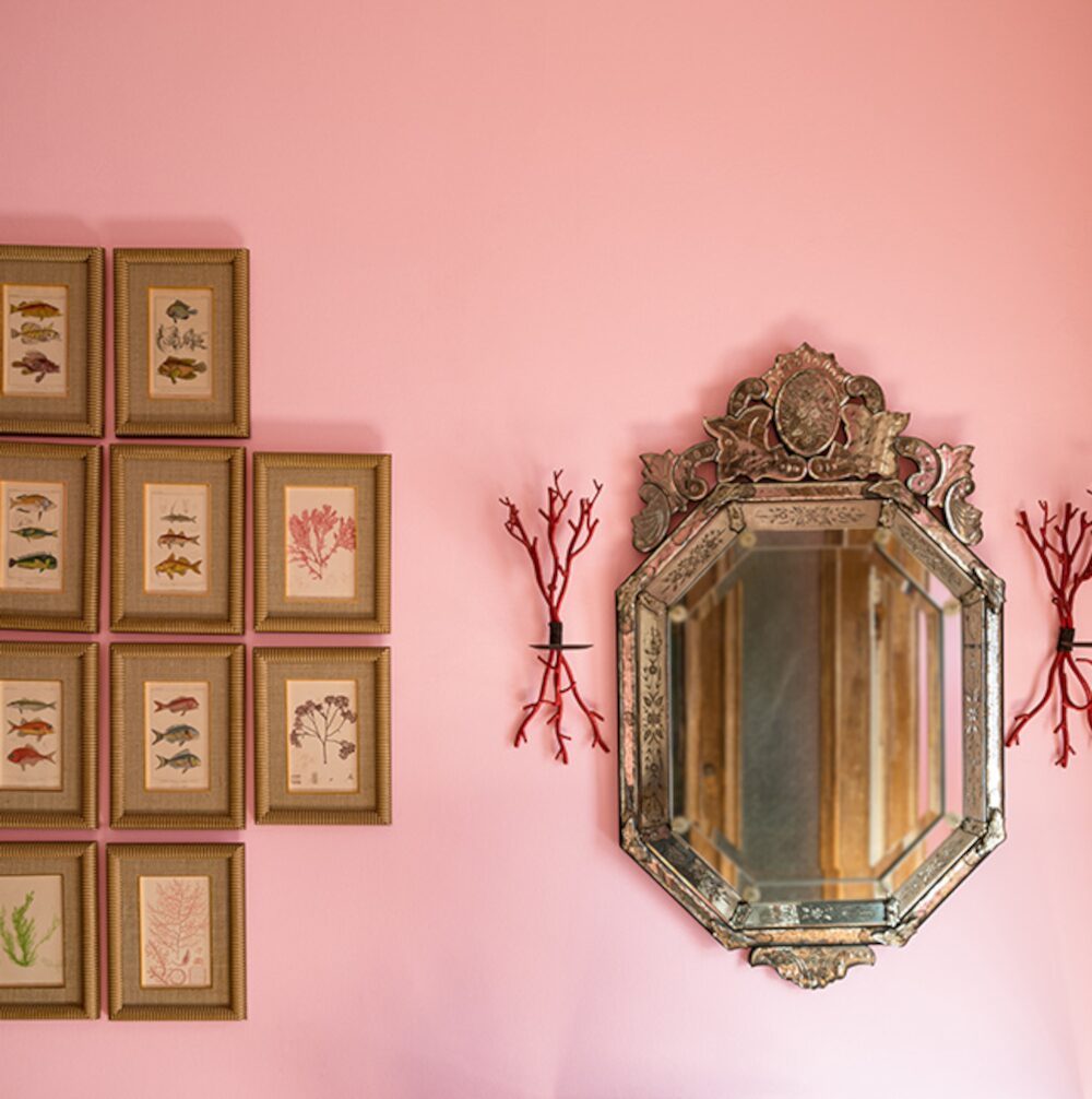 Na zdjęciu ozdobne lustro i kolekcja starych obrazów ściennych, które pięknie komponują się ze ścianą pomalowaną w kolorze Delicate Rose 2008-50.