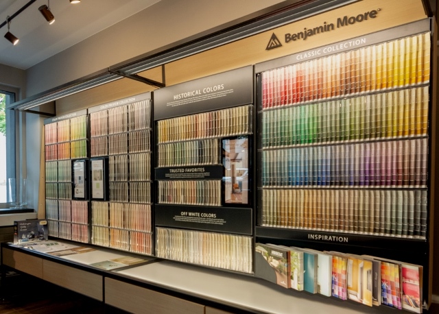 W salonie wydzielono specjalne miejsce dla marki Benjamin Moore, w którym uwagę przyciąga atrakcyjny, podświetlany ekspozytor z najpopularniejszymi paletami kolorów.
