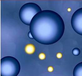 W tradycyjnej farbie cząsteczki pigmentu (żółte) luźno przylegają do cząsteczek spoiwa (niebieskie).