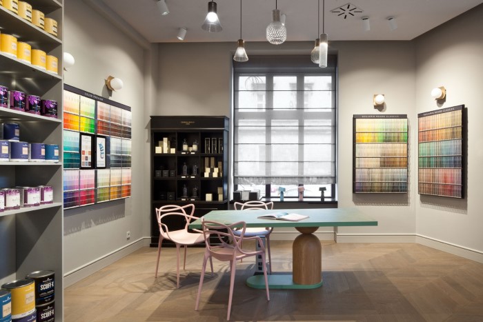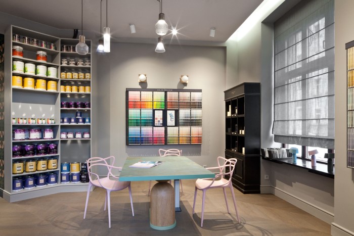 W showroom’ie pojawiły się atrakcyjne panele z kolorystyką marki Benjamin Moore. Wnętrze utrzymane jest w eleganckiej tonacji. Ściany pomalowano legendarnymi farbami amerykańskiego producenta.