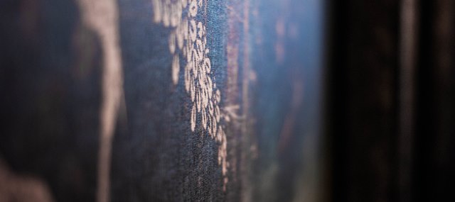 Obok, znalazł się duży regał zaprojektowany przez Viva Design za którym znajduje się połyskująca tapeta, będąca doskonałym tłem dla stonowanej abstrakcji.