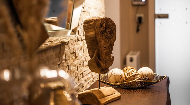 Ścianę przy konsoli wypełnia naturalny kamień w jasnej tonacji. Stworzono dekoracyjny łuk nad wnęką, która prowadzi do gabinetu i łazienki, wykończony połyskliwymi płytkami.