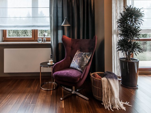W gabinecie znalazł się również fotel wraz z podnóżkiem w tym samym kolorze. Uwagę przykuwa elegancka lampa podłogowa zaprojektowana w klasycznym stylu oraz okrągły stolik pomocniczy ze złotą podstawą.