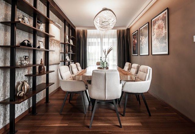 Stół otacza sześć krzeseł w jasnej, kremowej kolorystyce. Nad stołem zawieszono dużą, owalną lampę z ramą z niklowanej stali i abażurem z kryształowymi zawieszkami.