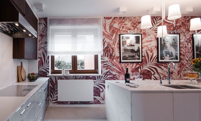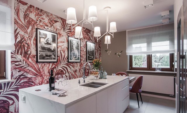 Ściany w tym wnętrzu wypełnia nieszablonowa i oryginalna tapeta z motywem roślinnym w kolorze czerwonym, wprowadzająca do wnętrza nutkę ekstrawagancji.