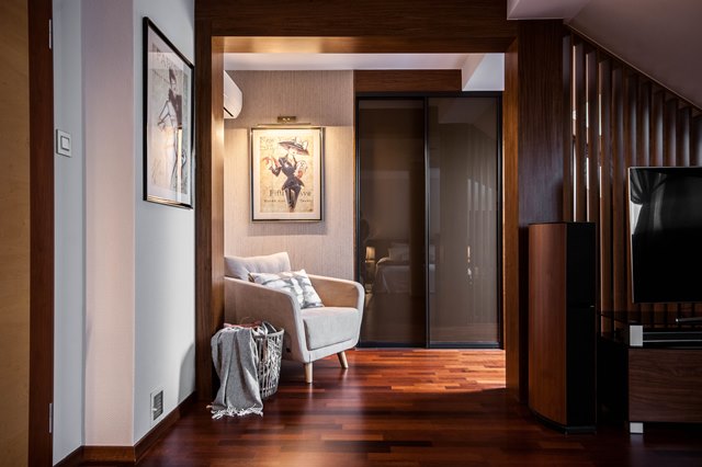 Dla pozostałych ścian wybrano satynowy fornir. Aranżację uzupełnia lakierowana deska podłogowa, stanowiąca idealne tło dla eleganckich dodatków.