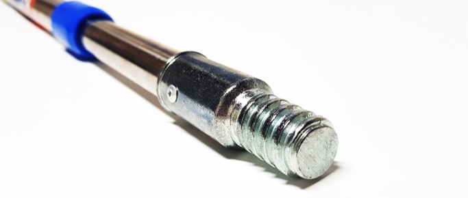 Pole is equipped with standard threaded metal tip to use with roller frame and traditional, reliable locking and adjusting system.