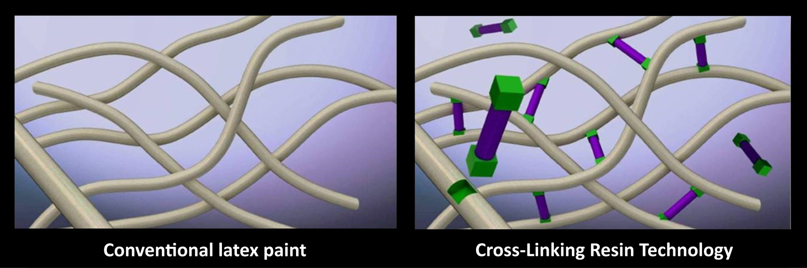In conventional latex paint, after application, during drying process called coalescence, the water evaporates and the particles "melt" together as a polymer strands intermingle. Finally the coat is created in the form of matrix.