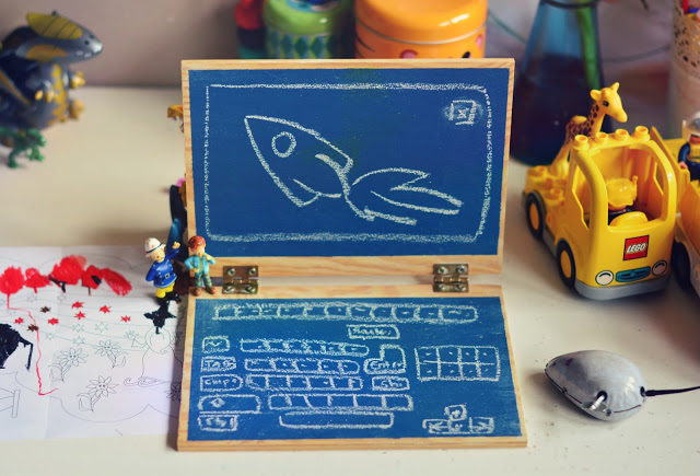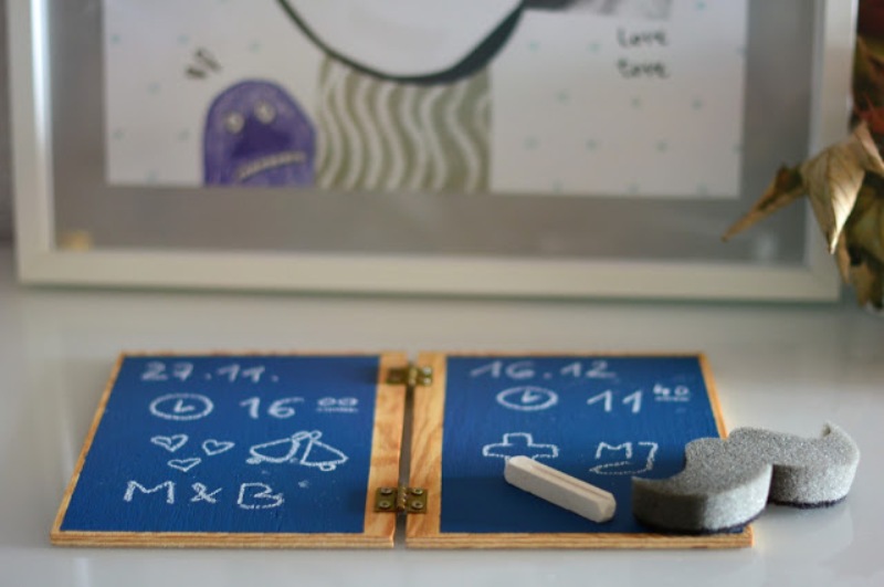Po demontażu naklejek, oczyszczeniu drewna i przeciągnięciu go tablicową farbą okazało się, że powstał gadżet, który w zależności od potrzeb domowników staje się notatnikiem, tabliczką – przypominajką, rodzinną ramką na zdjęcia, a nawet analogowym laptopem, który z miejsca zyskał aprobatę najmłodszego domownika.