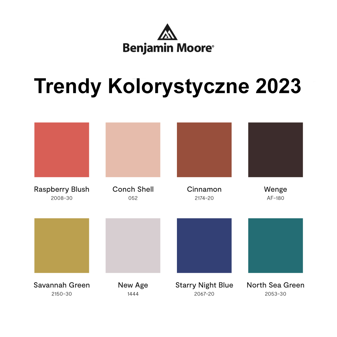 Stawiając na mocno nasycone odcienie, Benjamin Moore zaprezentował również paletę TRENDÓW KOLORÓW 2023, która obejmuje 7 dodatkowych odcieni towarzyszących kolorowi roku Raspberry Blush.