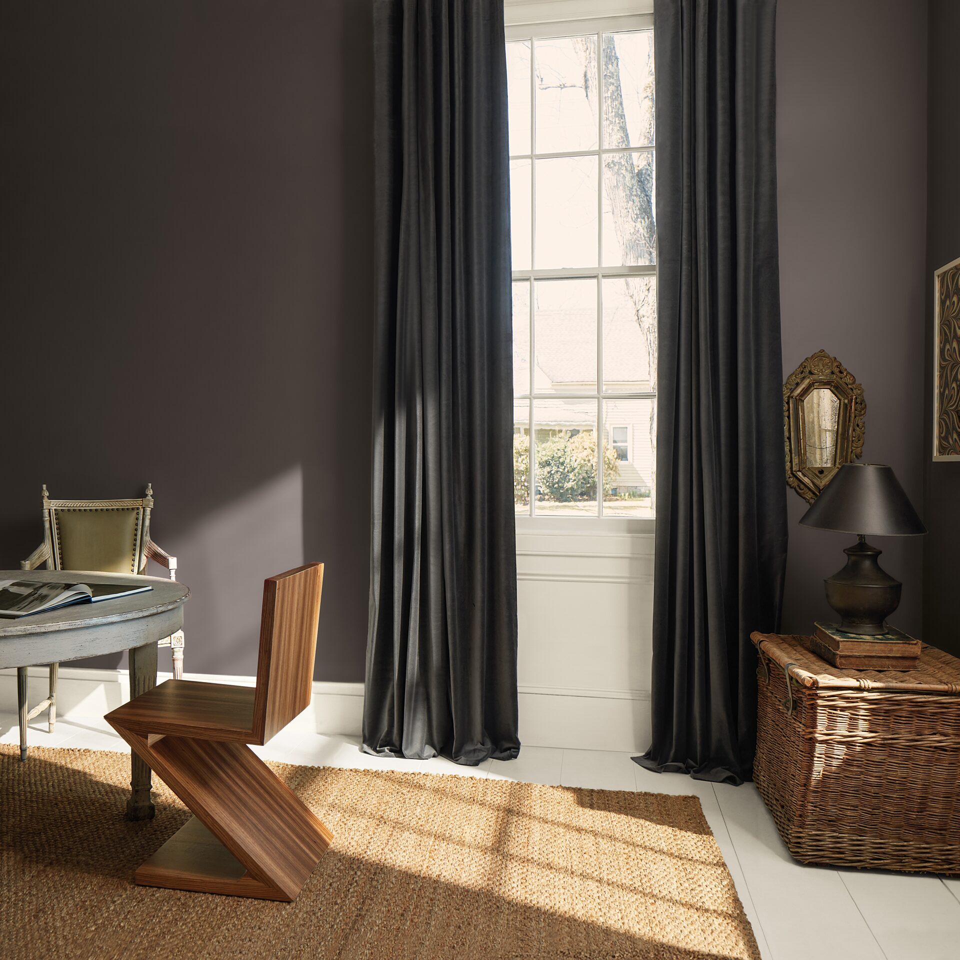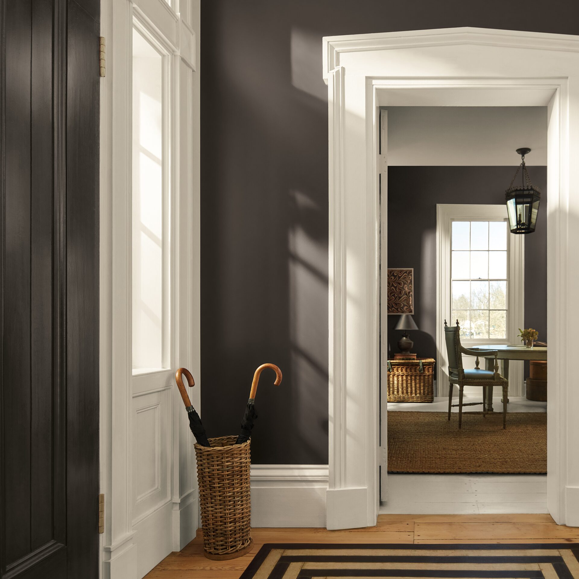 Z uwagi na fakt, że Silhouette jest neutralnym, głębokim odcieniem, nie ma ograniczeń co do jego zastosowania na ścianach i sufitach. Odcień doskonale podkreśla neutralny odcień mebli oraz białe listwy drzwi, futryn i sztukaterii. Kolor użyty na drzwiach wejściowych zapewnia ciepłe powitanie.