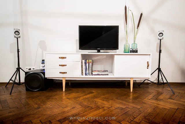 To był nasz pierwszy, mały sukces- metamorfoza stołu nie tylko sprawiła nam radość, ale spotkała się także z wieloma pozytywnymi opiniami w sieci. Postanowiliśmy pójść za ciosem i zrobić coś trudniejszego. Brakowało nam porządnej komody pod sprzęt rtv, więc wybór padł na solidny mebel z czasów PRL-u, który podrasowaliśmy po swojemu: