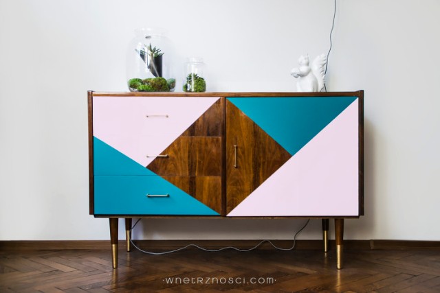 W wielu projektach,  jeśli natkniemy się na piękne drewno lub rzadko spotykany fornir - zostawiamy je w stanie surowym, podkreślając kolorem w innych miejscach. Np. cała biała komoda z surowymi nóżkami, lub jak to miało miejsce przy komodzie w geometryczne wzory,  pozostawiony nietknięty cały fornirowany blat.  Podczas pracy potrafimy zaszaleć, ale do pięknych detali podchodzimy sentymentalnie.
