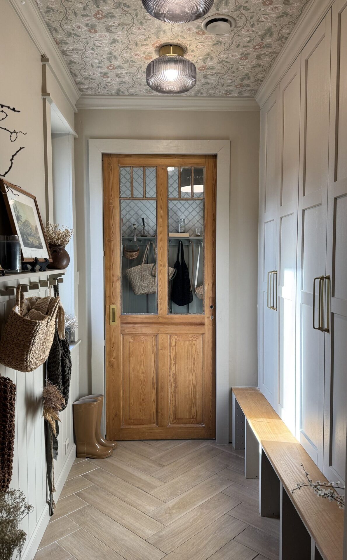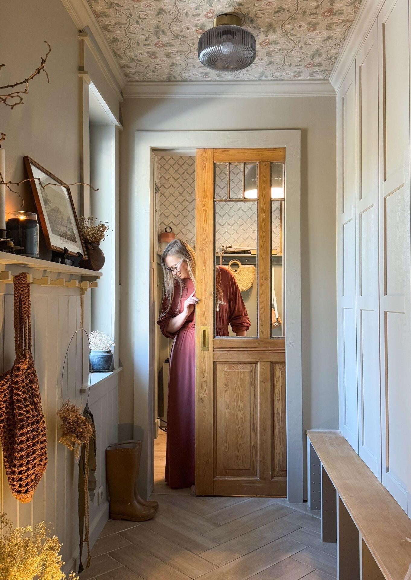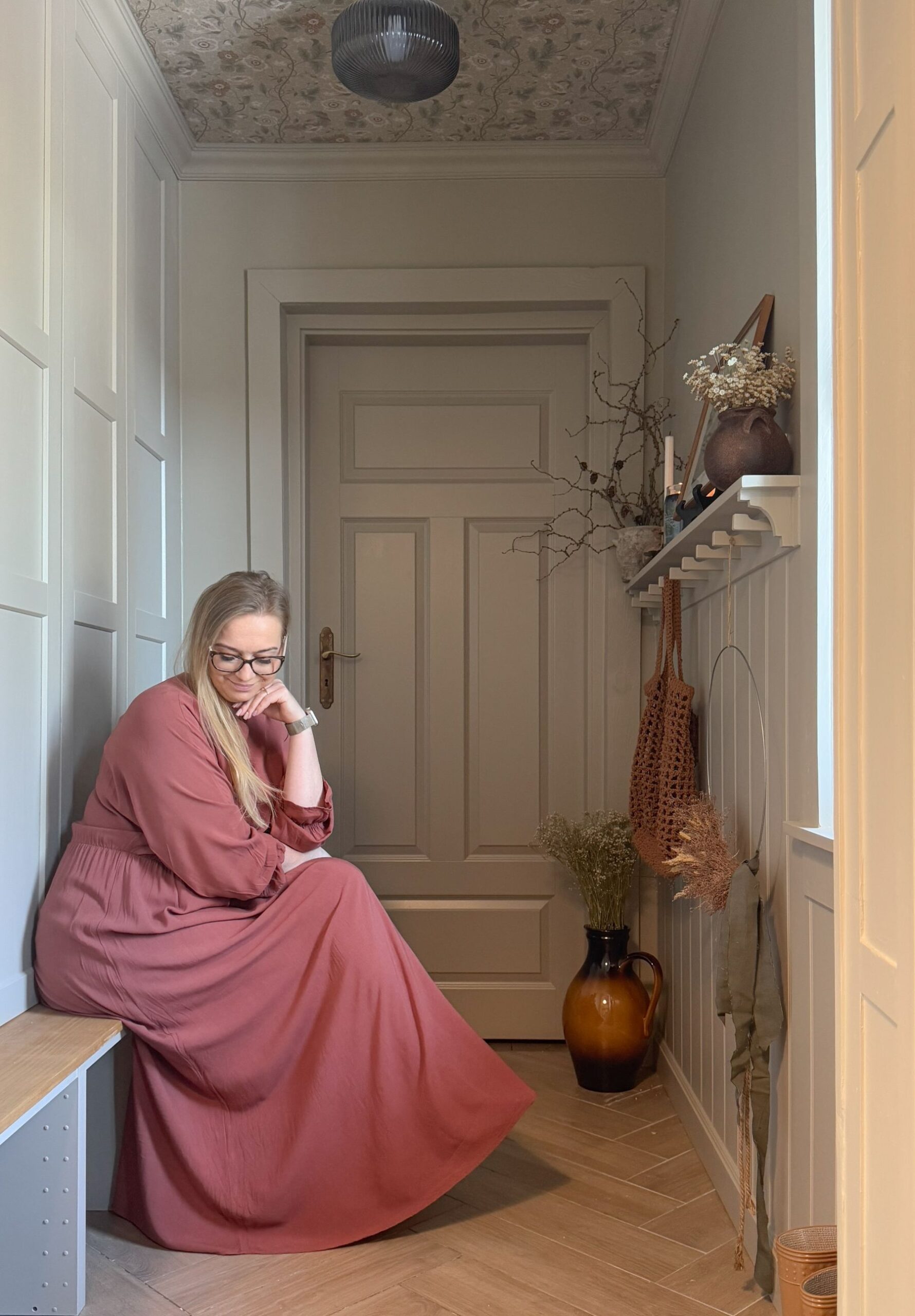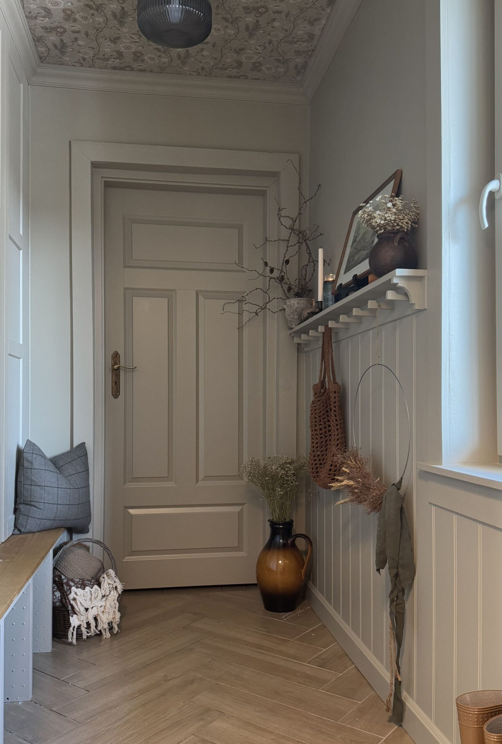 Tym razem postanowiła zmienić kolor drzwi, szafy w zabudowie, boazerii oraz niewielkich fragmentów ścian w drugim przedpokoju.
