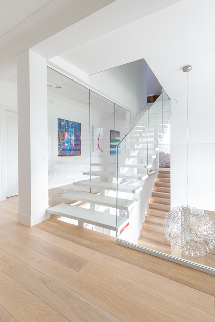 Cała klatka schodowa, podobnie jak reszta wnętrz, pomalowana została farbą marki Benjamin Moore w specyficznym odcieniu bieli - kolorze „Super White”. W ten sposób stworzono neutralne tło dla wielu elementów architektury wnętrza, które miały grać pierwsze skrzypce.