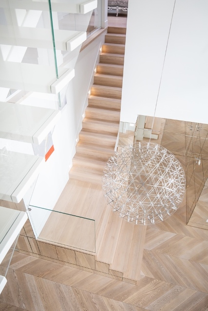 Na podłogę wybrano jodełkę francuską w odcieniu lekko bielonego dębu, wykonaną przez warszawską manufakturę City Design. Producent odpowiedzialny był również za dębowe schody dywanowe w tym samym kolorze.