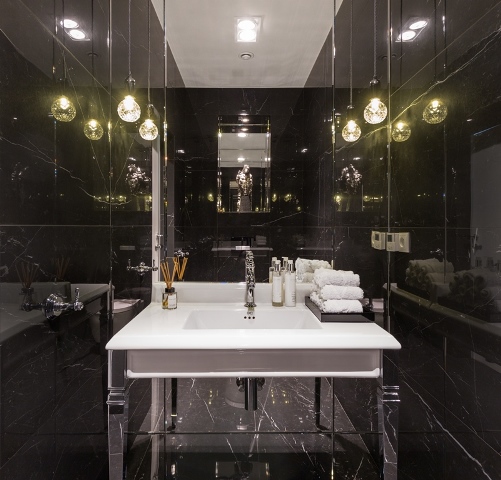 Łazienka gościnna została pokryta płytami czarnego marmuru Nero Marquina.