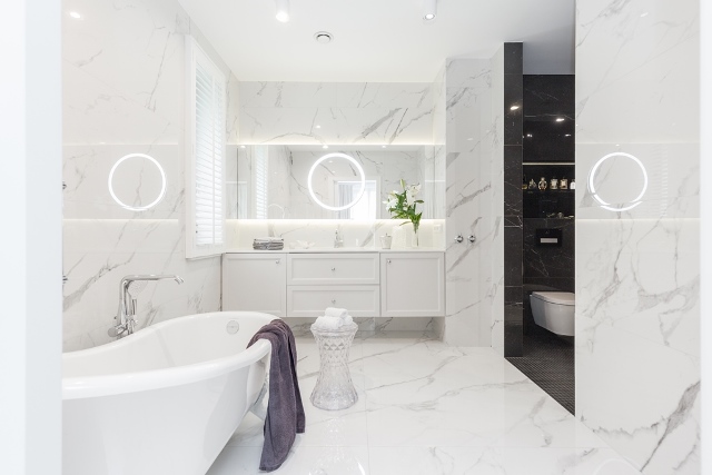 Pokój kąpielowy składa się ze „śnieżnej” części - białej, w której znalazła się zabudowa umywalkowa oraz ogromna wolnostojąca wanna brytyjskiej marki Victoria & Albert oraz z części czarnej, w której znajduje się toaleta, bidet i prysznic.