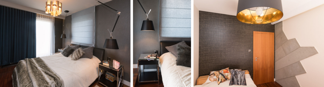 Sypialnie utrzymano w zdecydowanie chłodniejszej kolorystyce niż resztę wnętrz, ale wcale nie oznacza to, że brakuje w nich ciepła! Miękkie światło i przytulne tkaniny zdecydowanie podnoszą temperaturę.