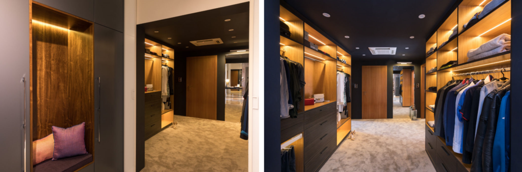 Po ich otwarciu wchodzi się do obszernej garderoby, która została zaprojektowana jak ekskluzywny butik. Tu też królują ciemne kolory – nasycone grafity Baby Seal 2119 – 30 i Blackberry 2119-20 są wzbogacone o chłodne tony, dzięki czemu perfekcyjnie wydobywają złote nuty z fornirów pokrywających podświetlane wnętrza szaf.