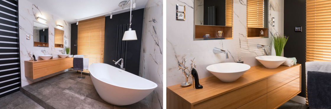 Z garderoby przenosimy się do drugiej łazienki, która z całą pewnością zasługuje na miano salonu kąpielowego. Kolorystyka znacznie się rozjaśnia, ale i tu znalazło się miejsce dla ściany w ciemnym graficie Jet Black 2120-10, który w duecie z bielą podkreśla urodę płytek z kamiennym motywem.